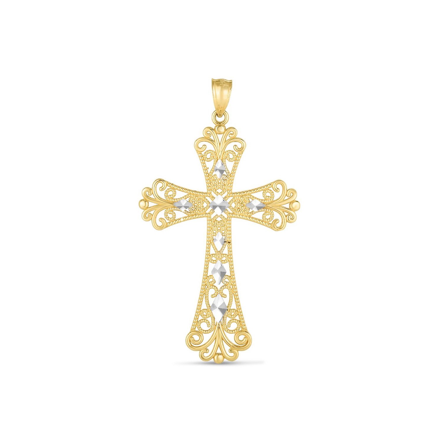 This highly fashionable Two-Tone Diamond Cut Pendant is crafted in 14k yellow & white gold with a high polish finish & hangs from a sleek bail. Perfect for pairing with any basic chain.