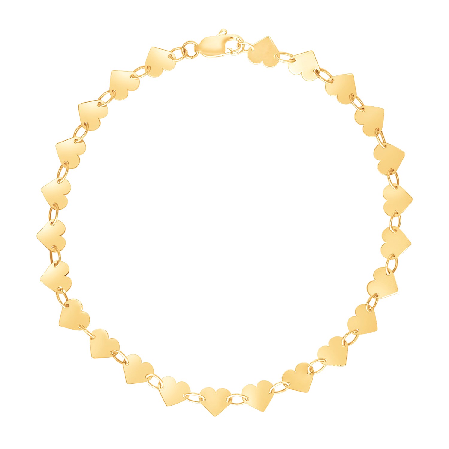 This bracelet features a bright, happy collection of shiny hearts, illuminated by the brilliant shine of 14k yellow gold. Bracelet is 7 inches long and closes with a lobster clasp.