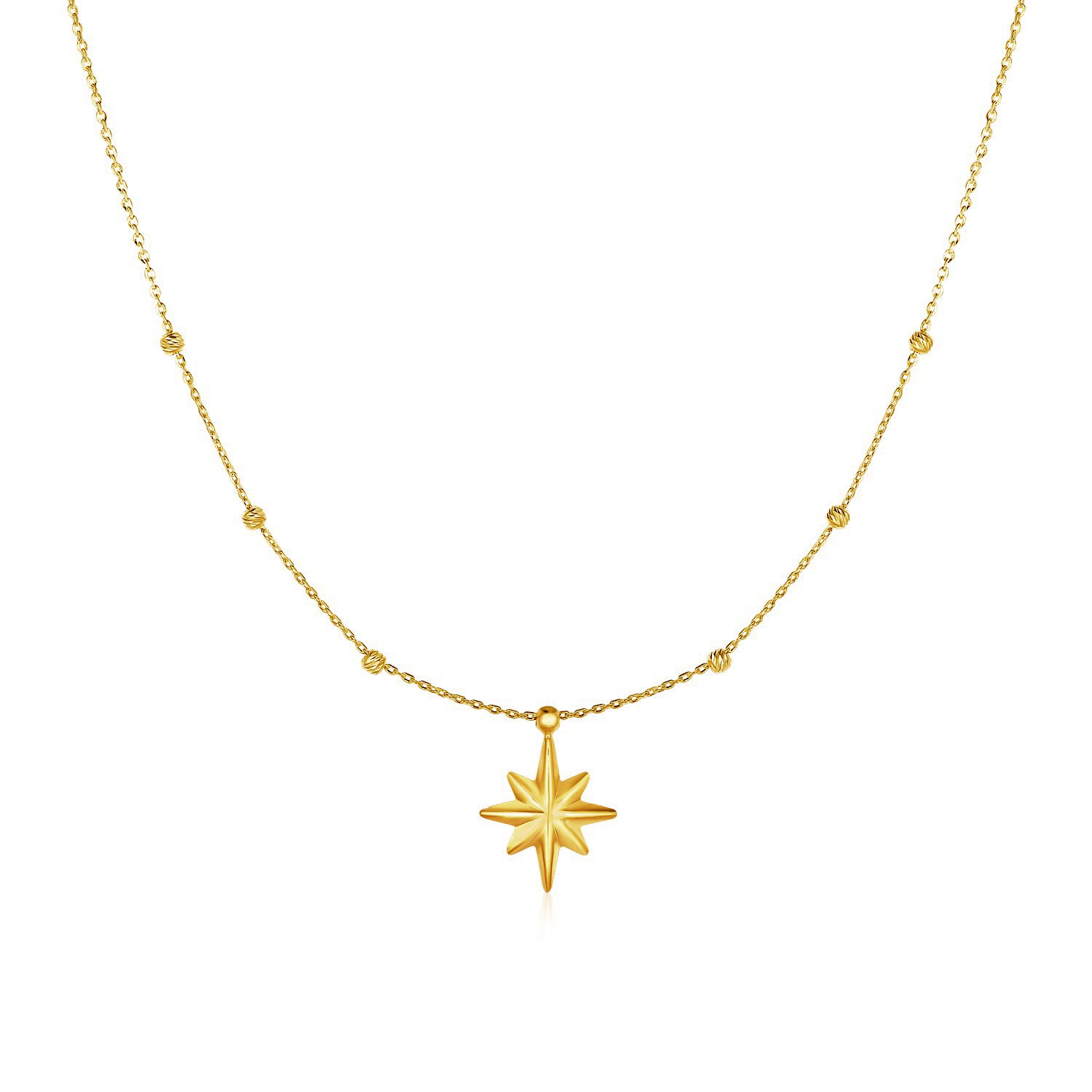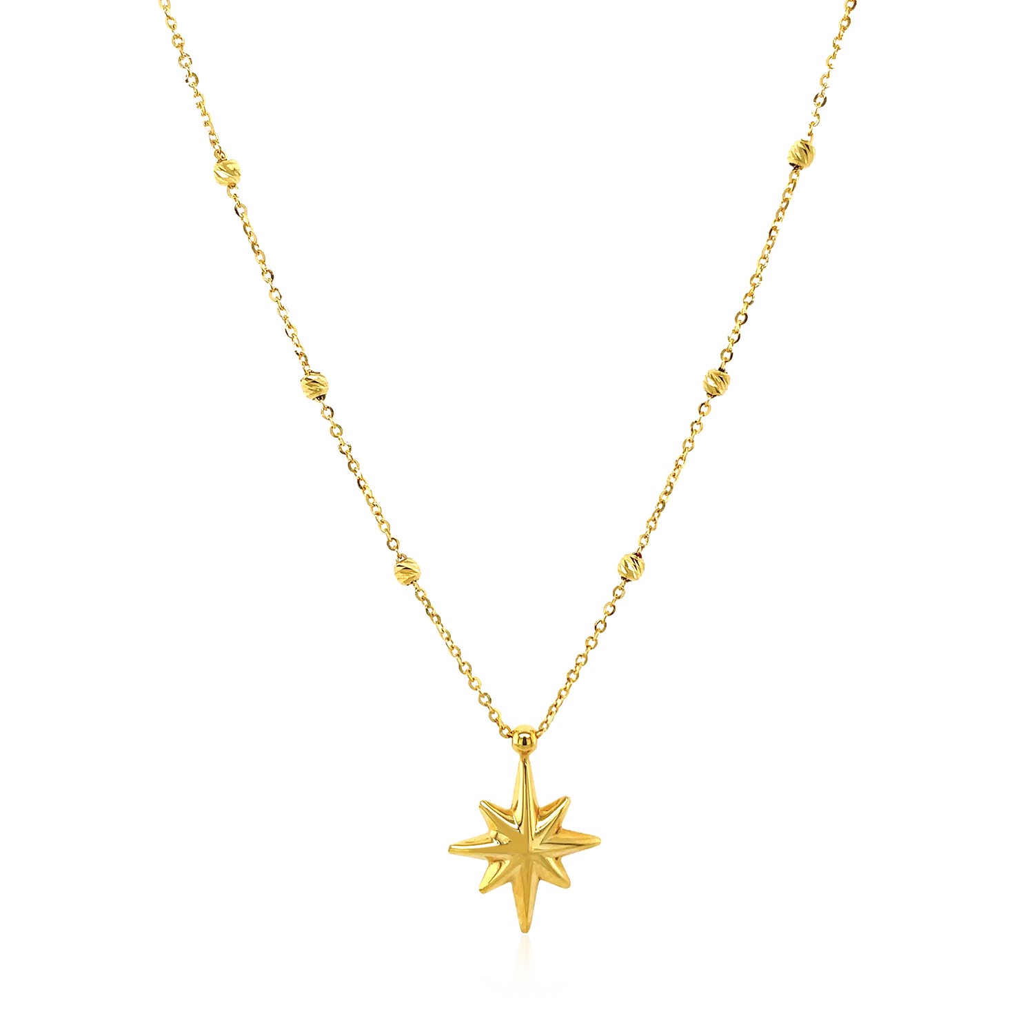 A beautiful, textured eight-pointed star and delicate beads add dazzle to this exquisite 14k yellow gold necklace. Necklace is 18 inches long and closes with a spring ring clasp.