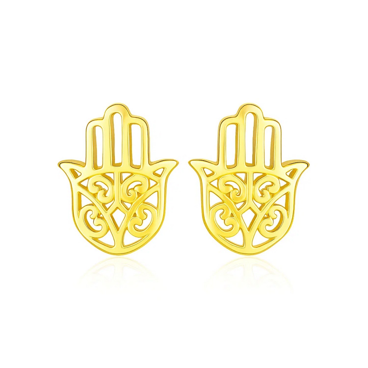 Wear these lovely Hand of Hamsa 14k yellow gold post earrings as a symbol of good fortune and protection. Post earrings are 8mm long and are held in place by pushback clasps.
