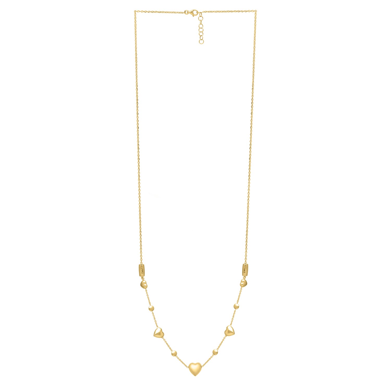 Elegant 14k yellow gold puff heart necklace with a chain and two hearts, adjustable 16 inches to 24 inches long, secured by a lobster clasp.