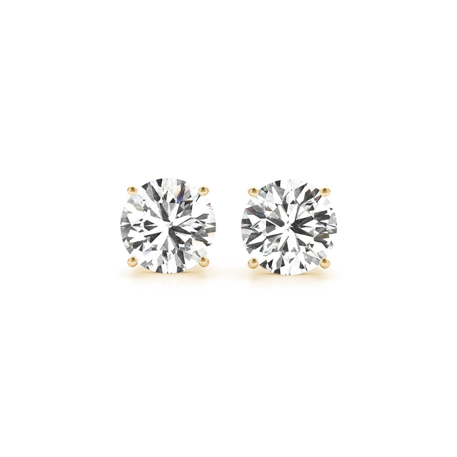 Four prong 14k yellow gold stud earrings feature two perfectly matched IGI certified lab grown round cut diamonds with a total weight of 4 carat. Secured with push backs.