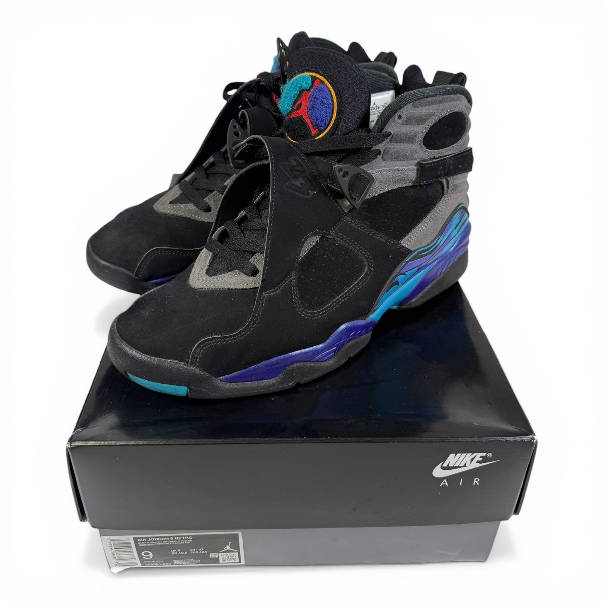 - SHOES/BOOTS: NIKE – MICHAEL JORDAN MODEL AIR JORDAN 8 RETRO, BLACK, SIZE 9 US – 40 EUROPE