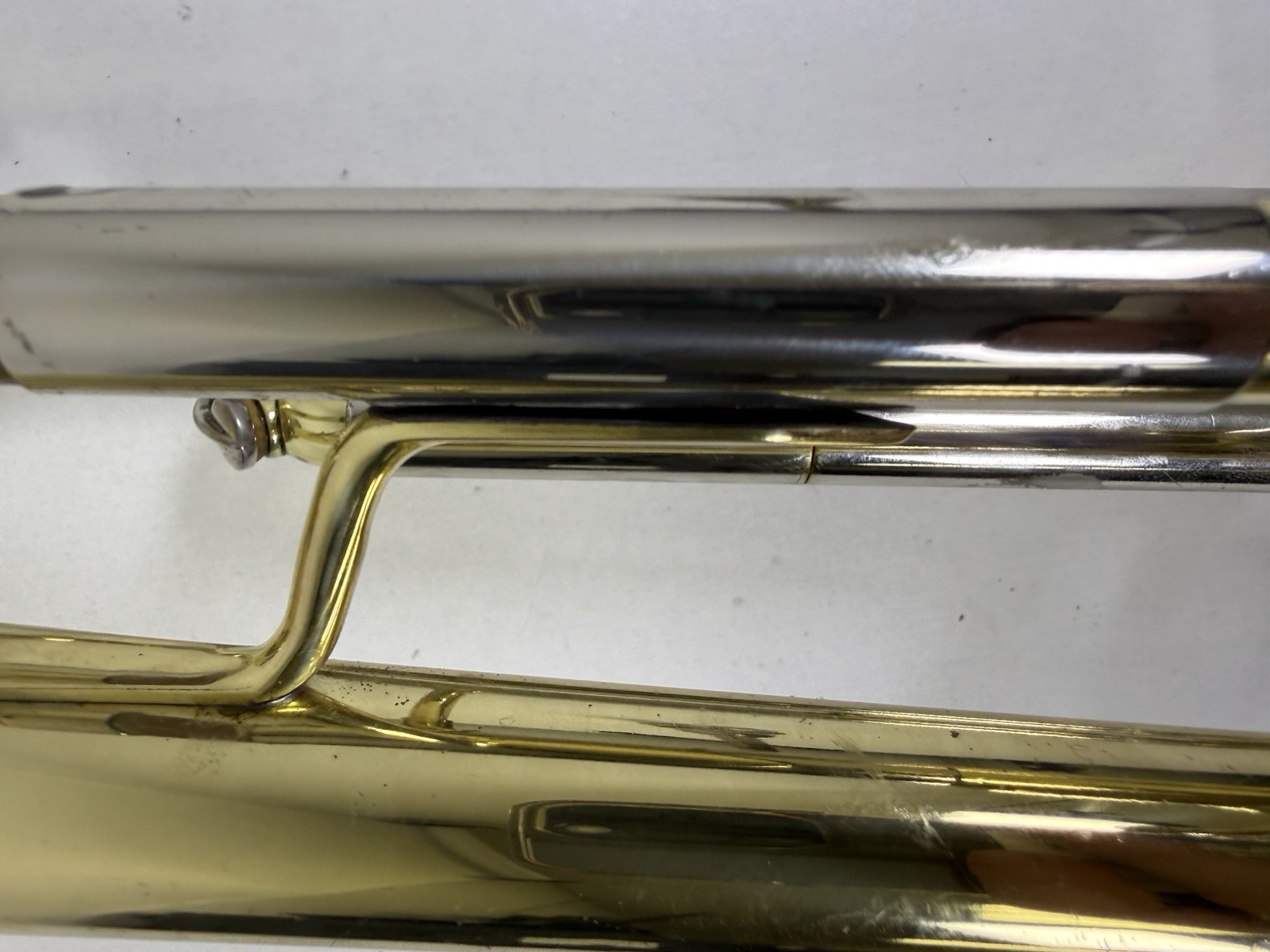 Used and needs some TLC. The tuning slide is seized, one of the mounts need resoldering, and one was already resoldered. Please see pics. Should make a good player with a little elbow grease.