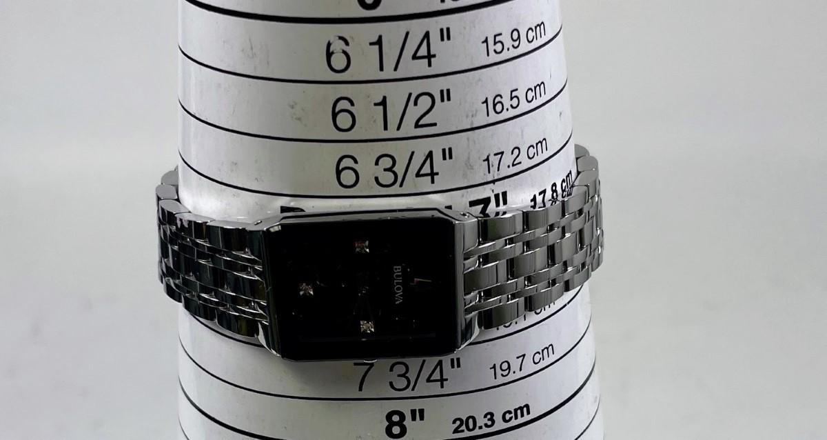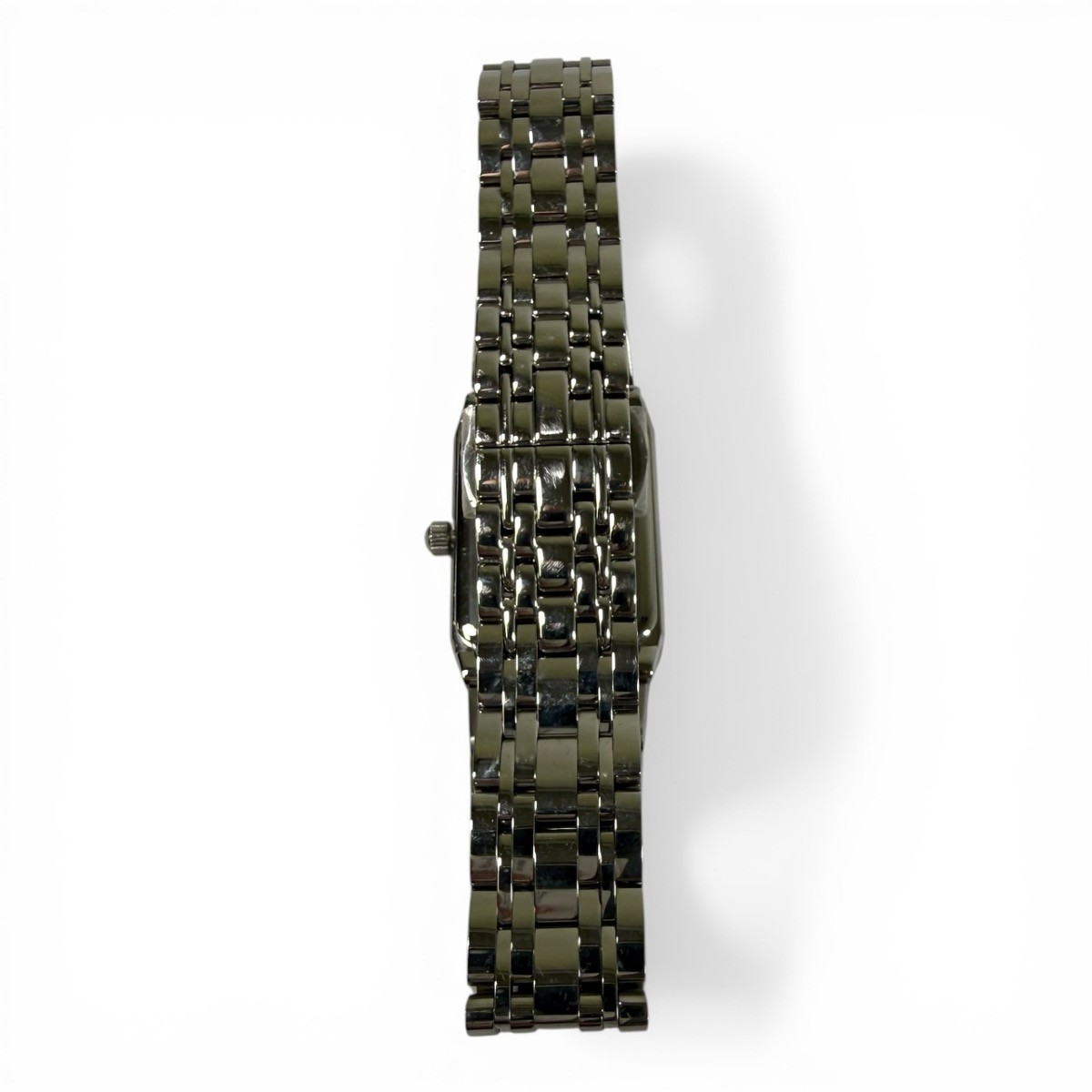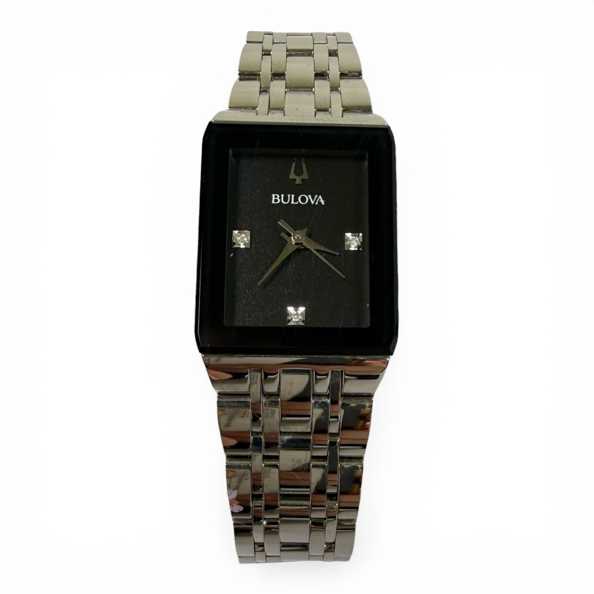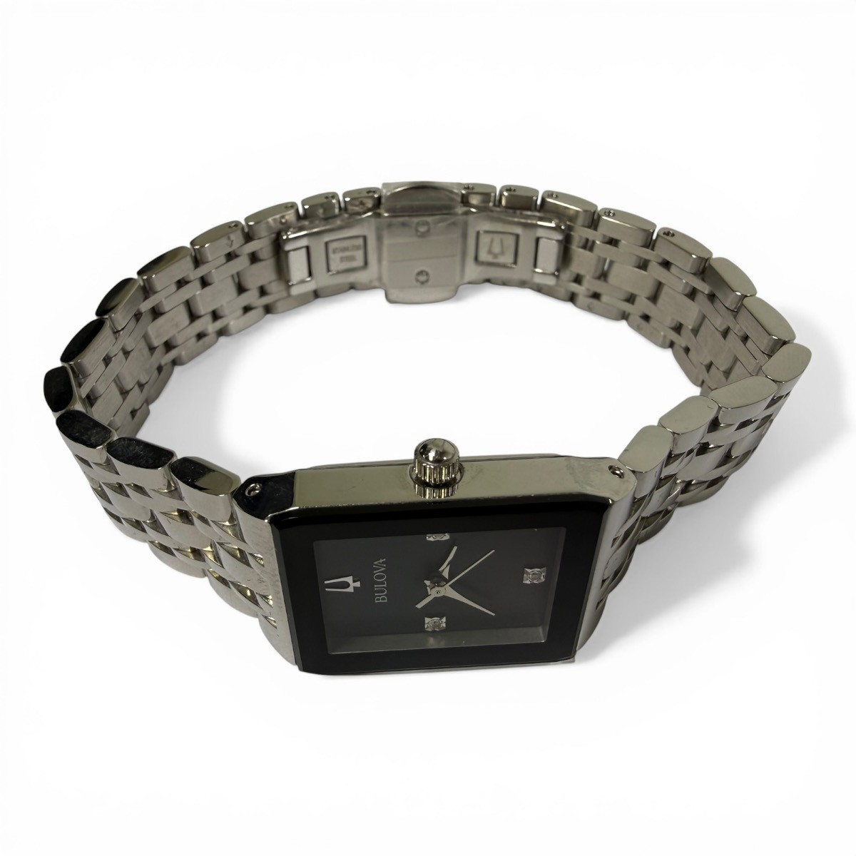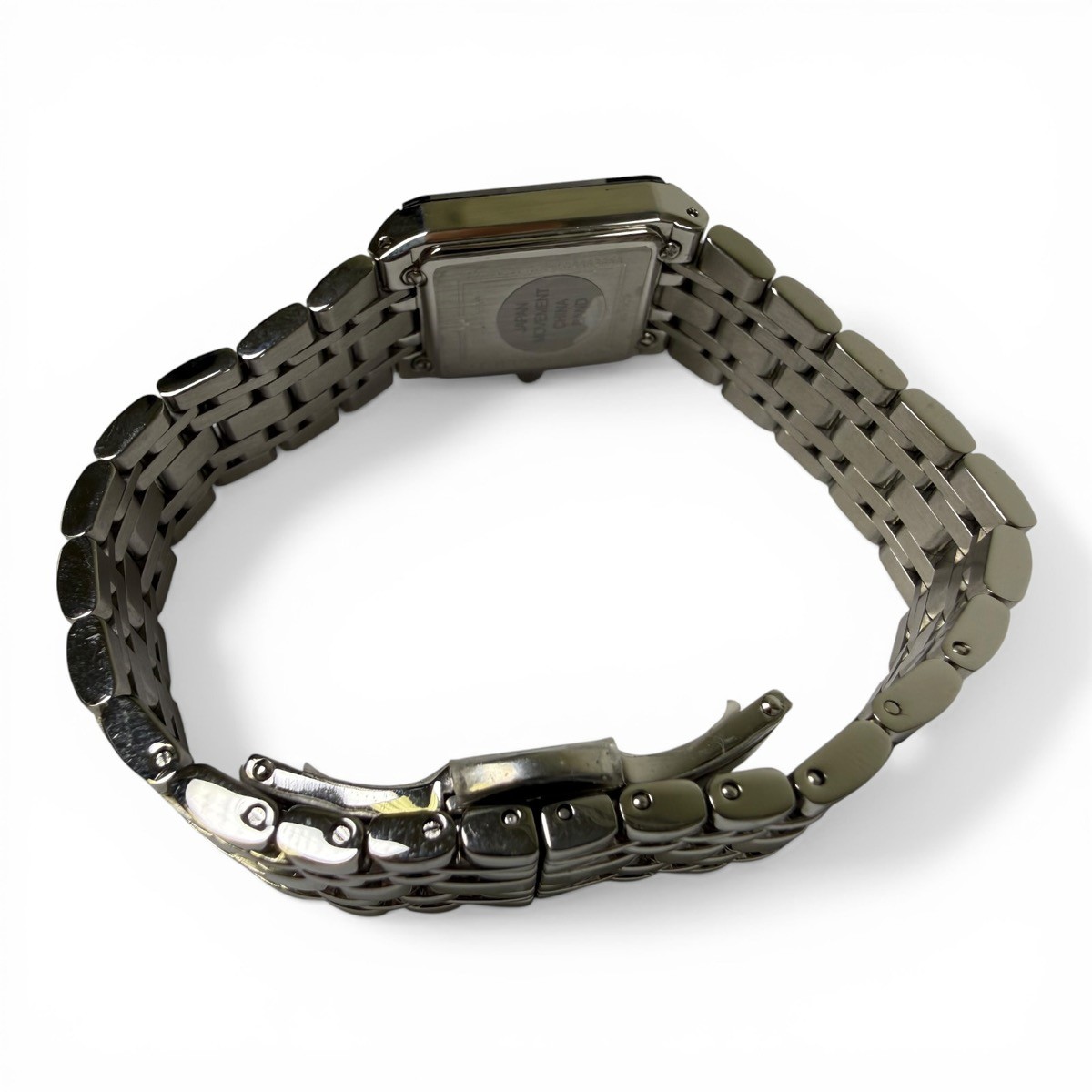 Watch Condition Rating? 90% – EXCELLENT. EVIDENCE OF USE IS VISIBLE TO THE UNAIDED EYE. SCRATCHES ARE LIGHT, BUT MORE NUMEROUS THAN "NEAR MINT". IF THE WATCH HAS BEEN RESTORED, ALL ORIGINAL REPLACEMENT PARTS HAVE BEEN USED. STRAP CLEARLY USED BUT NO STAINS. NO DENTS OR DINGS ARE DETECTABLE, AND THE BRACELET HAS LITTLE WEAR. WORKING PERFECTLY, NEEDS NO REPAIR OR SERVICE. Case Material | Color STAINLESS STEEL Movement Type? Quartz (Battery) Watch Band Material? STAINLESS STEEL Watch Feature? NOT SPECIFIED Year of Manufacture Not Specified Box and Papers ? NO BOX OR PAPERS Style ? DRESS Display? ANALOG Face Color Black Watch Shape Rectangle