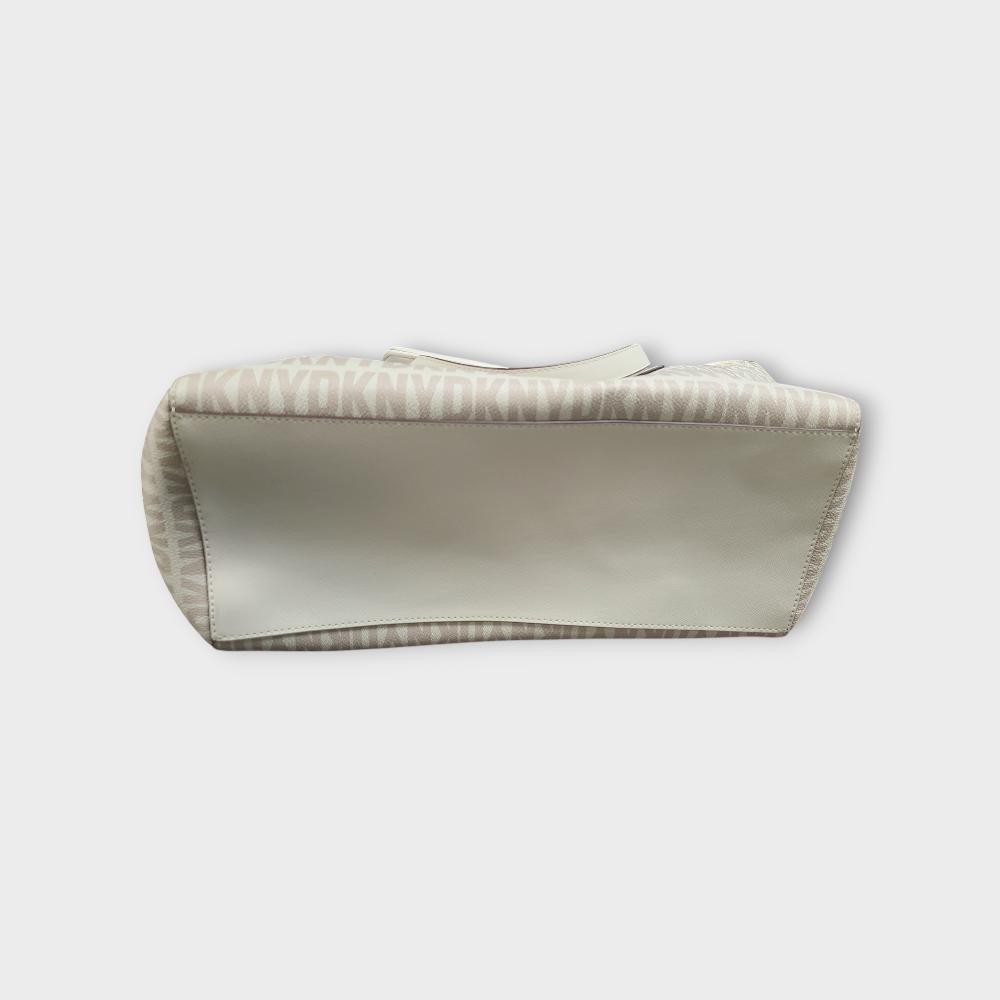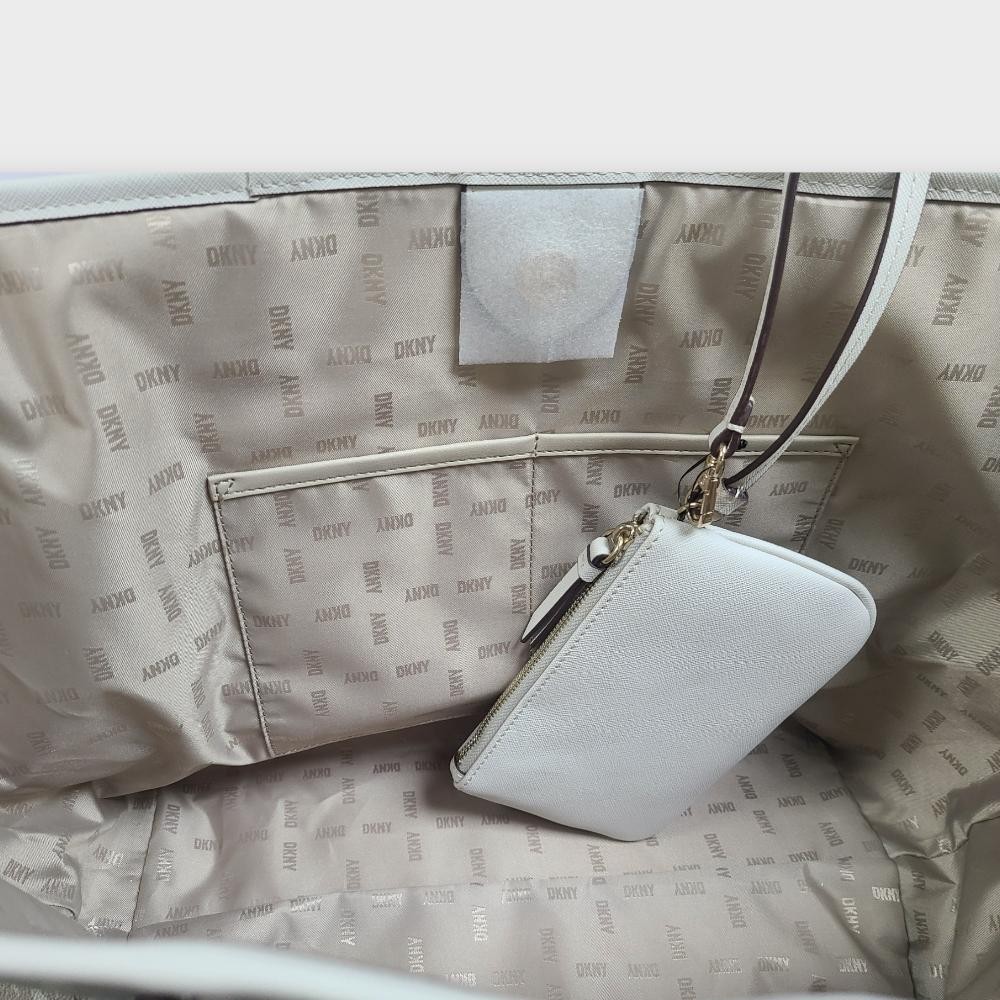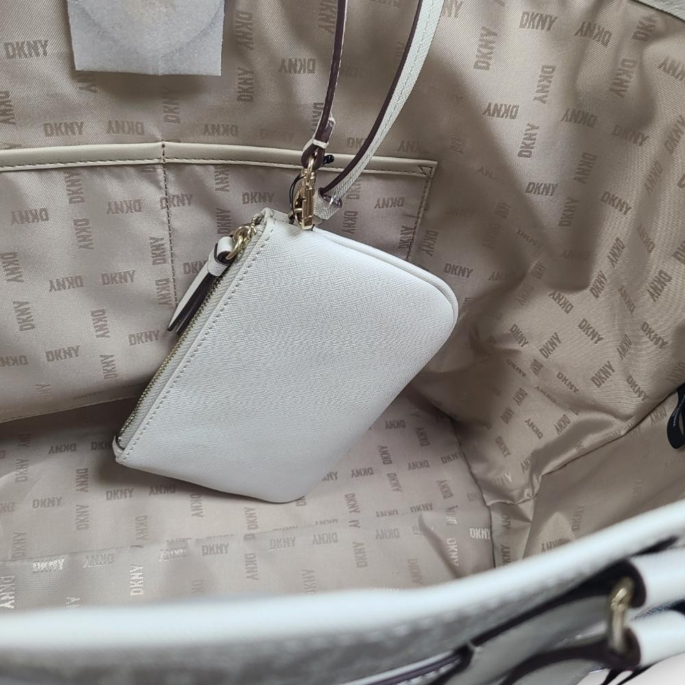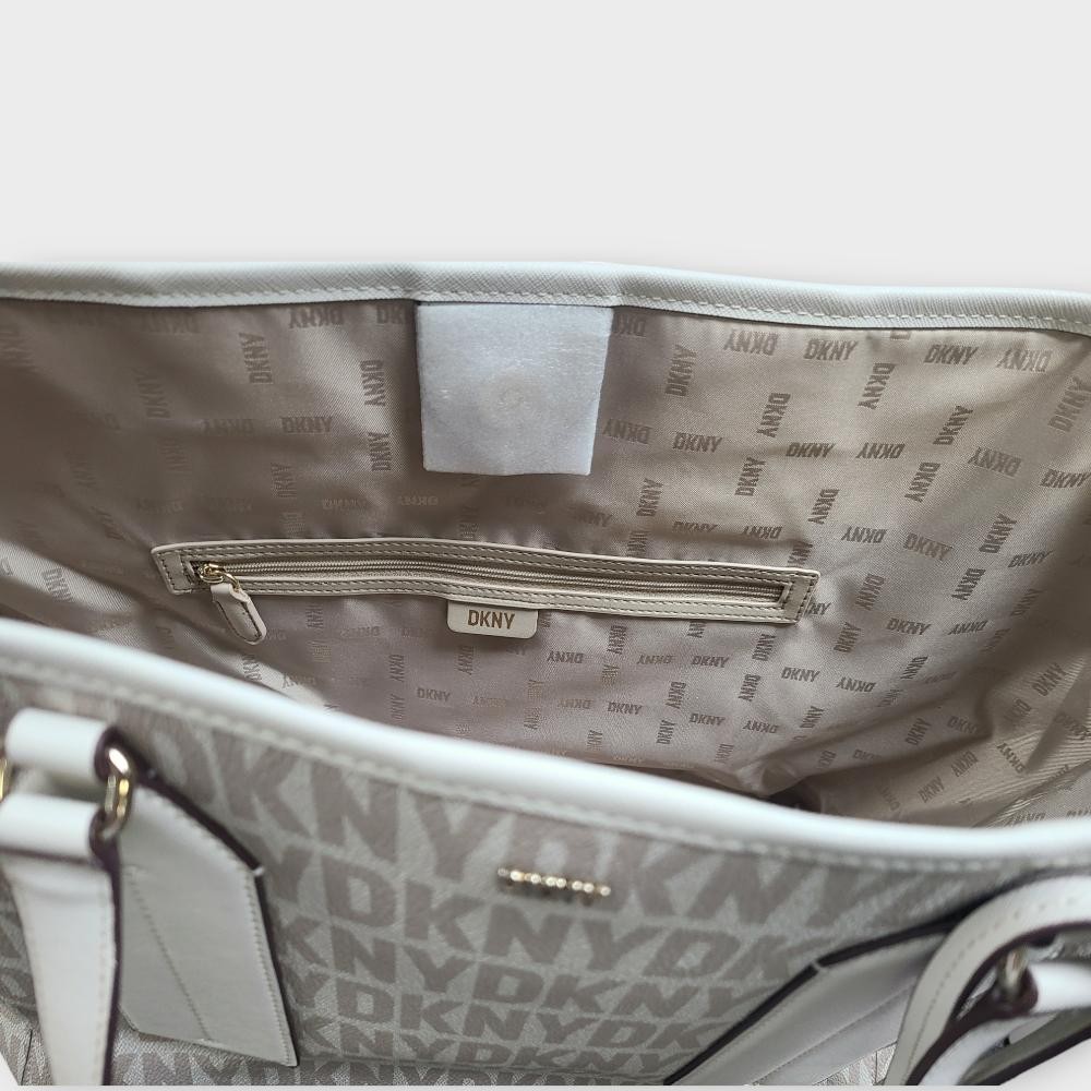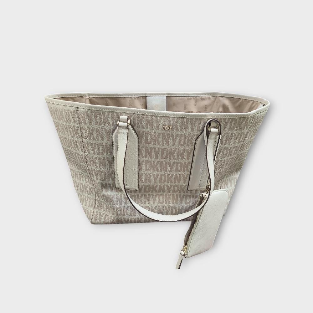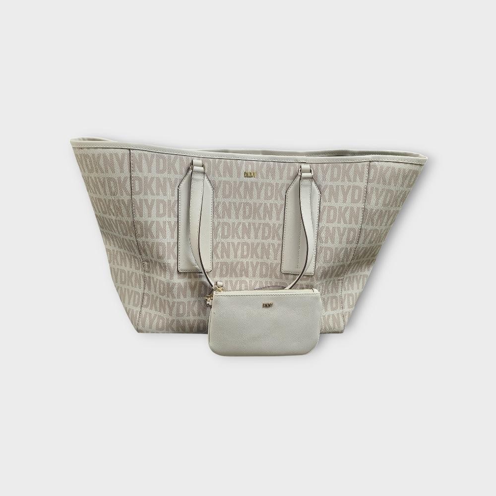 - Covered in a repetitive DKNY logo, this large tote comes with a coordinating zippered pouch for added storage and security.