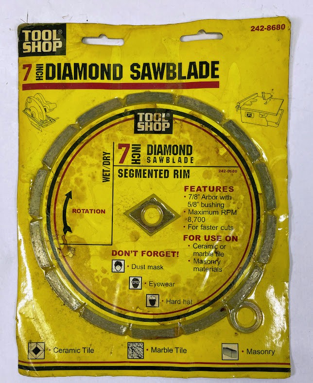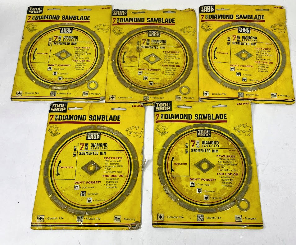 BRAND NEW LOT OF 5 TOOL SHOP 7-INCH DIAMOND SAWBLADE WITH SEGMENTED RIM FOR USE ON CERAMIC OR MARBLE TILE, MASONRY MATERIALS. 2 OF THE PACKAGES ARE MISSING THE 5/8″ BUSHING. SOME OF THE PACKAGING HAS SHELF WEAR BUT THE BLADES ARE NEW.