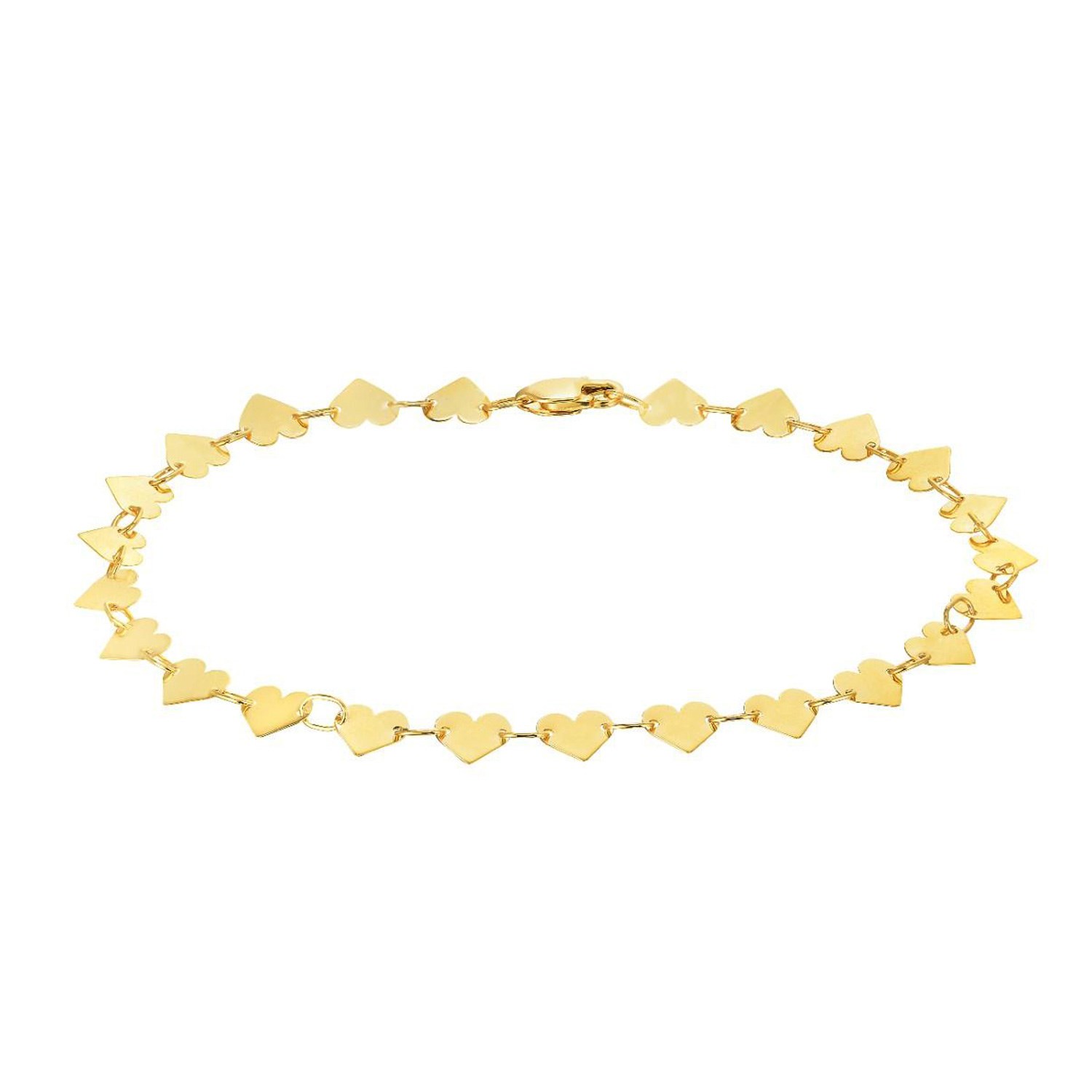 Delicate hearts shine as they dance gracefully along this finely crafted 7 1/4 inches chain bracelet, capturing the light with every movement and casting playful reflections. This 10k yellow gold piece stands as a testament to love and exquisite artistry, making it an ideal gift for someone special or a treasured addition to your collection. Each heart mirrors inner beauty and elegance, embodying timeless charm and grace.