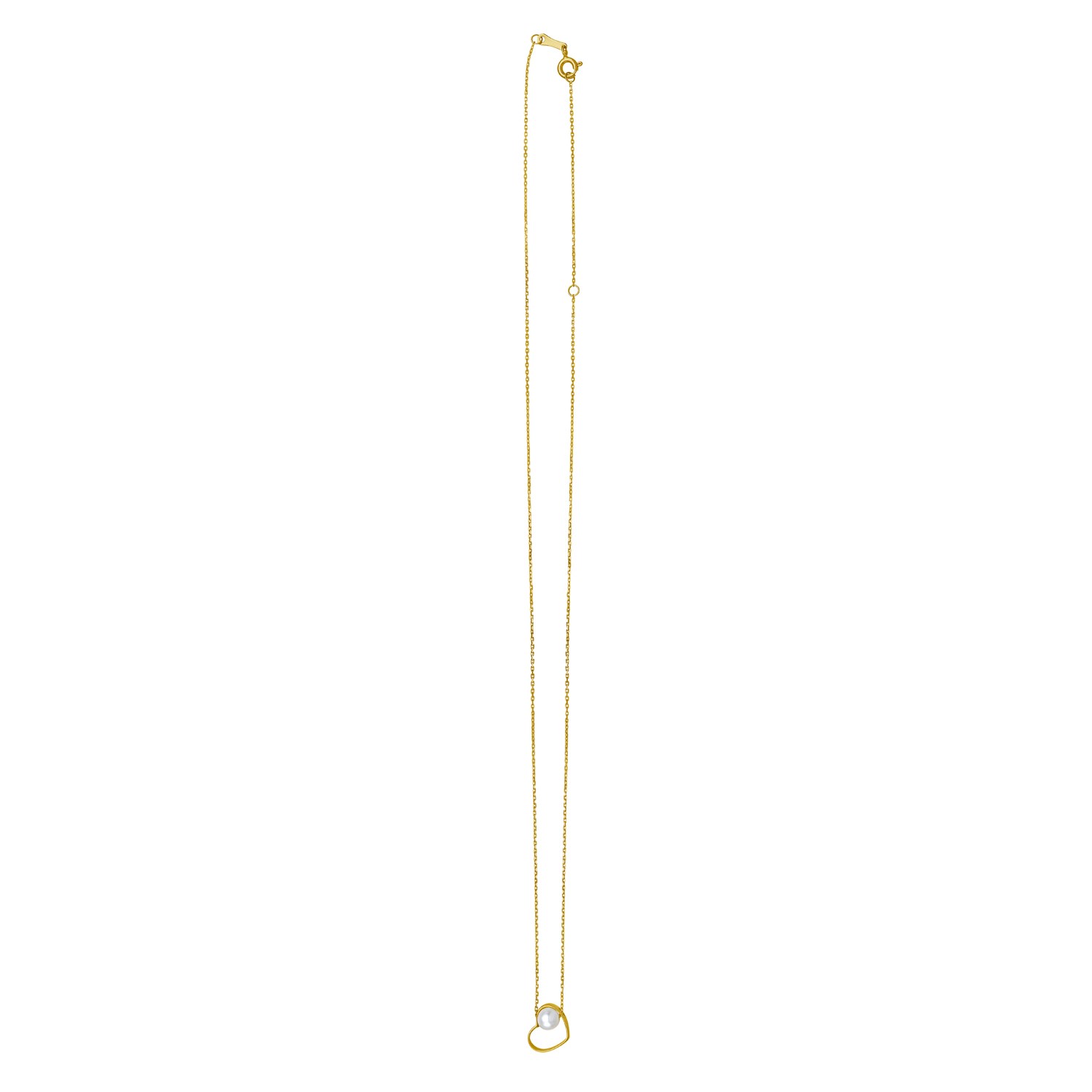A delicate diamond-cut open heart, with a freshwater pearl nestled inside, slides gracefully along an 18 inches 14k yellow gold chain. This unique design pairs the radiant glow of gold with the pearl’s gentle luster, forming a striking and elegant focal point. Complete with a spring ring clasp and an adjustable jump ring at 16 inches, this necklace is ideal for those who appreciate refined artistry and subtle beauty.