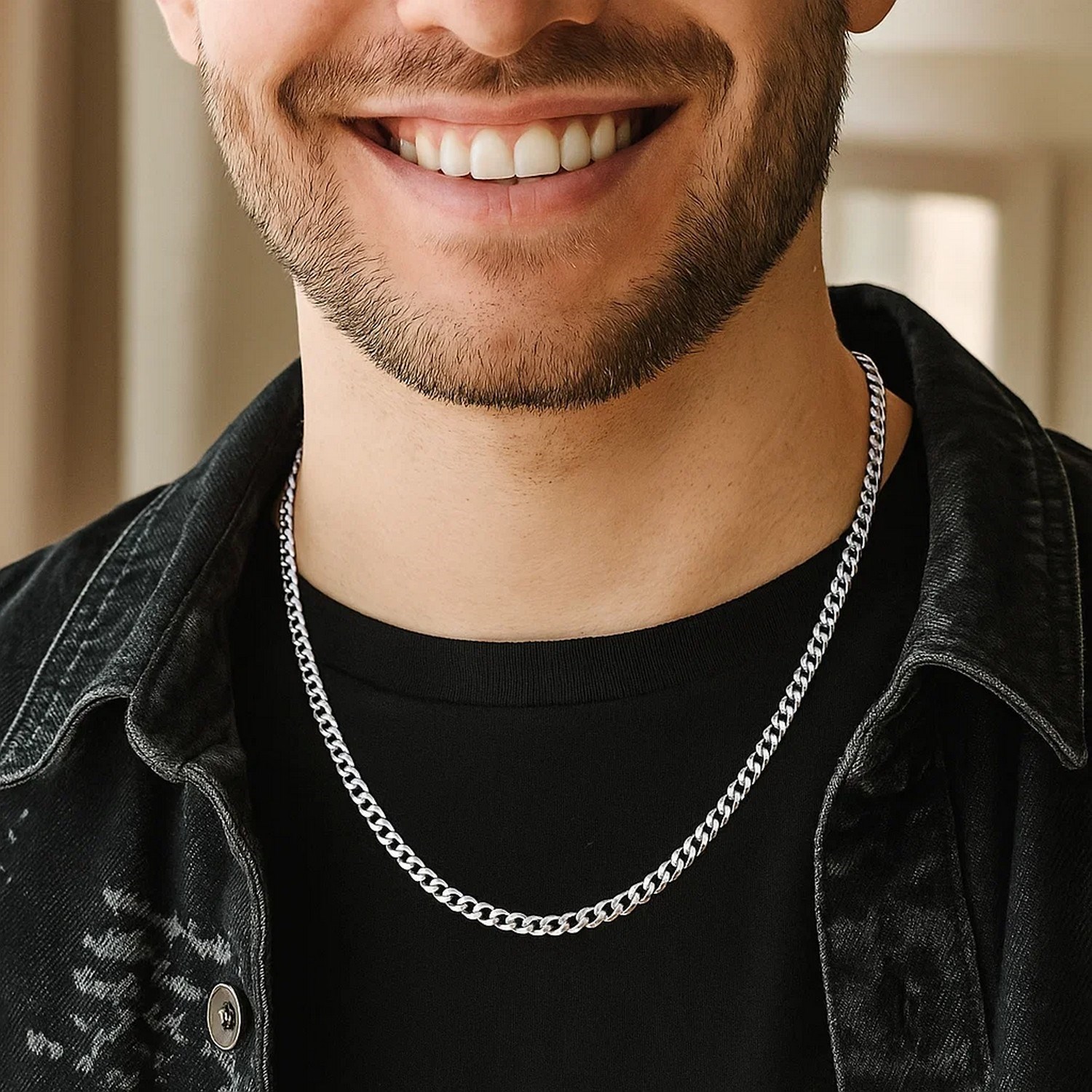 This classic rhodium plated chain is crafted in gleaming sterling silver and has a width of 3.7 millimeters. Featuring a curb chain design, it is secured with a lobster clasp.