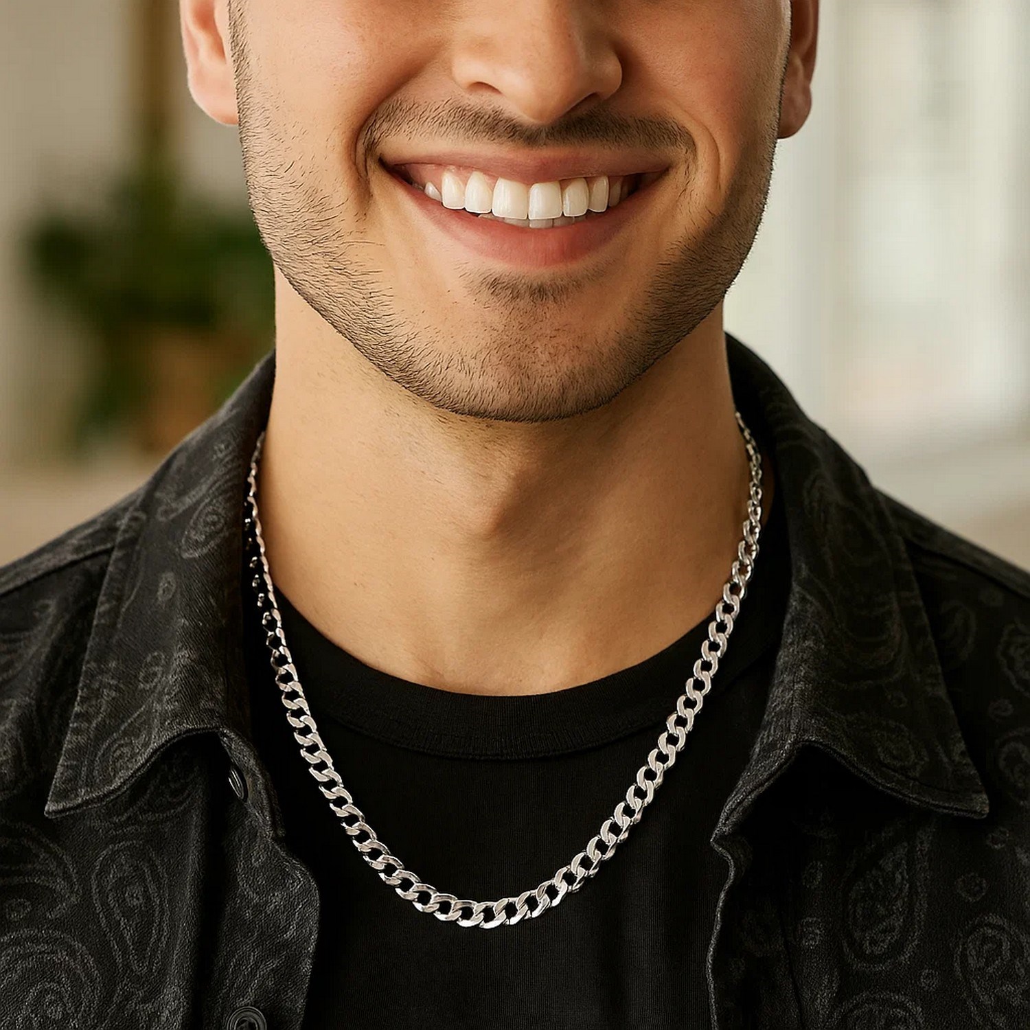 This classic rhodium plated chain is crafted in gleaming sterling silver and has a width of 4.7 millimeters featuring a curb chain design is secured with a lobster clasp.