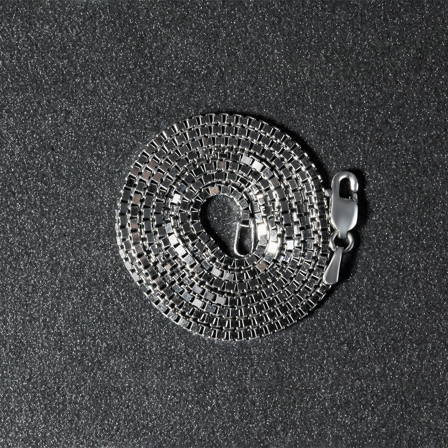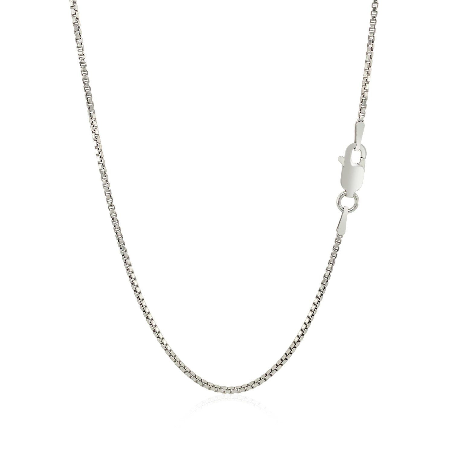 This rhodium-plated box chain comes in sterling silver and has a width of 1.3 millimeters.