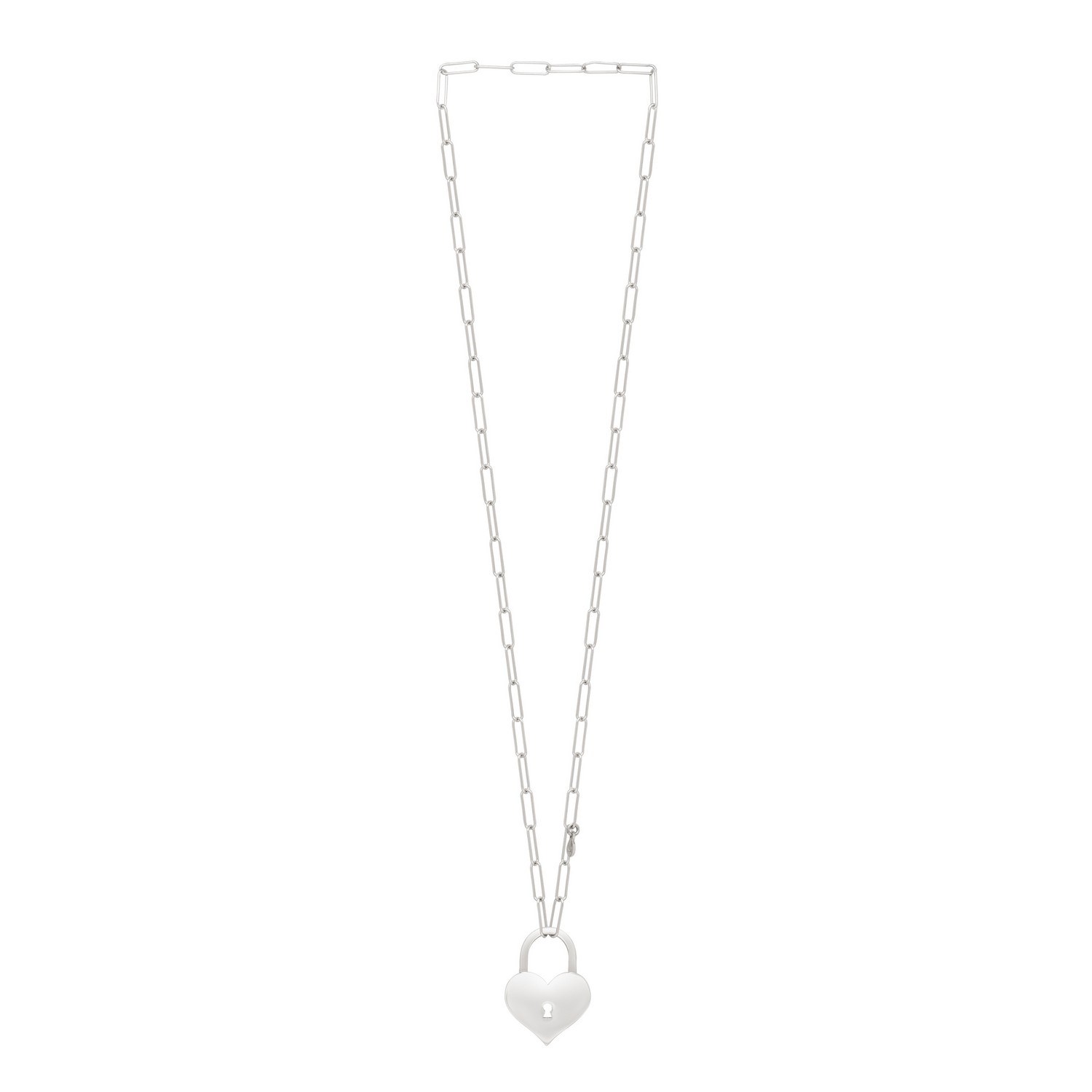 Make a chic statement with this Sterling Silver Rhodium Plated Padlock Heart Necklace. Featuring a sleek heart-shaped padlock on a radiant rhodium-plated chain, it blends modern edge with romantic charm. Perfect for everyday wear or gifting.