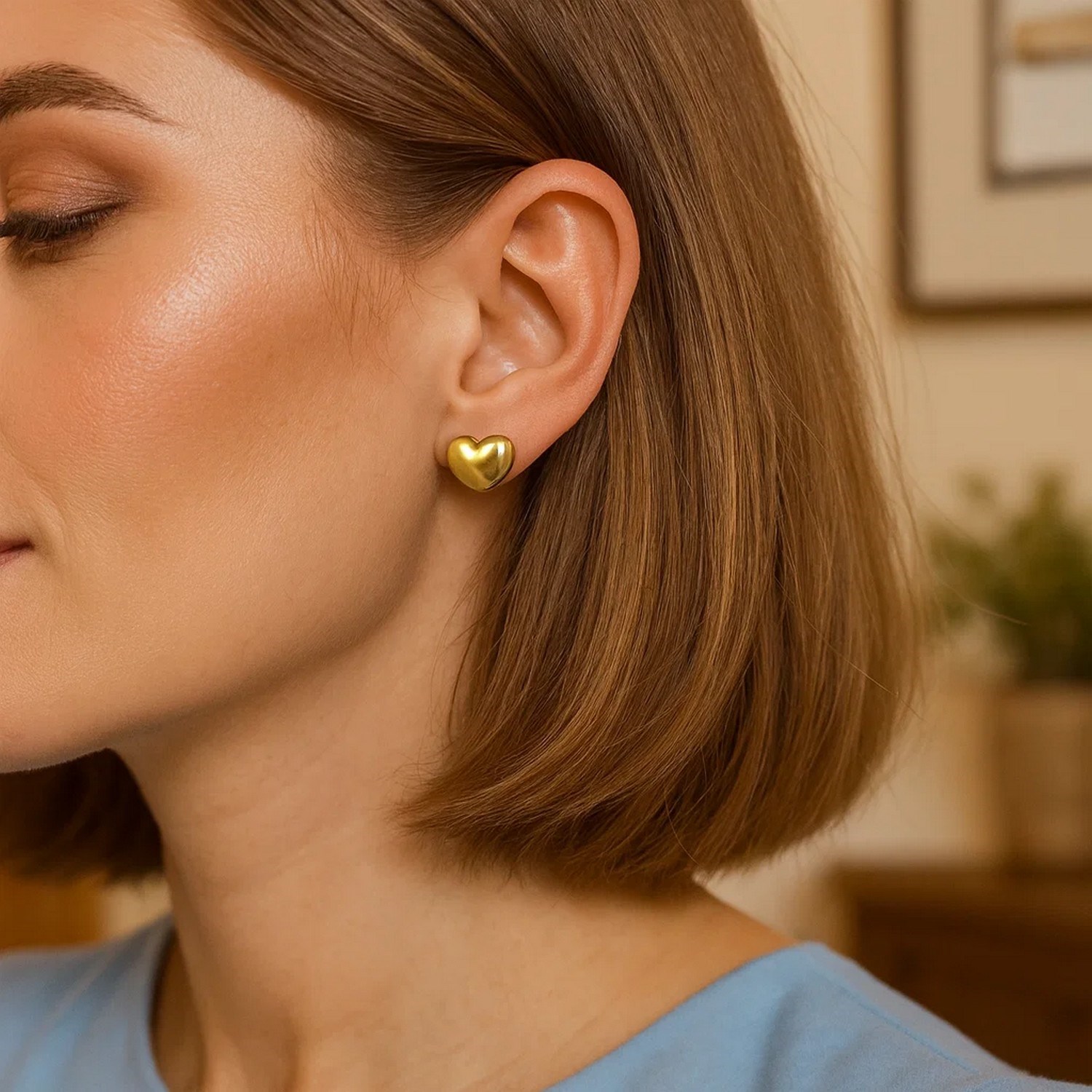 Charming sterling silver yellow gold plated puffed small heart stud earrings featuring a smooth, polished finish with a warm golden glow. The puffed heart design adds a touch of romance and elegance, perfect for everyday wear or a thoughtful gift.