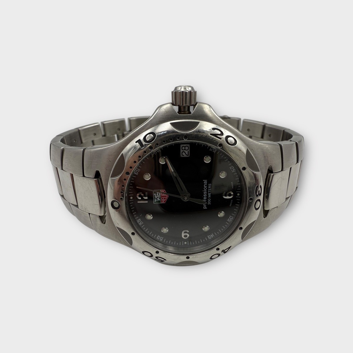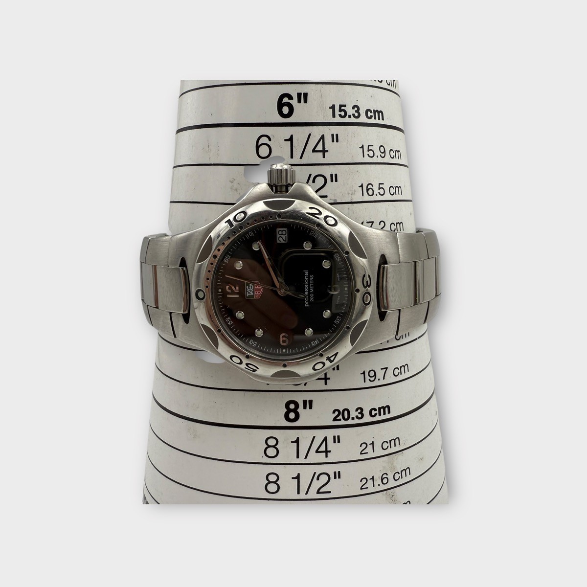 - Scratch on lens. Pre-Owned “Tag Heuer Kirium Mens Watch”. Features a 39mm stainless steel case & braclet, black dial with silver hands Silver indices and date window. Does not include box nor papers. Will fit a 7 1/4″ wrist.