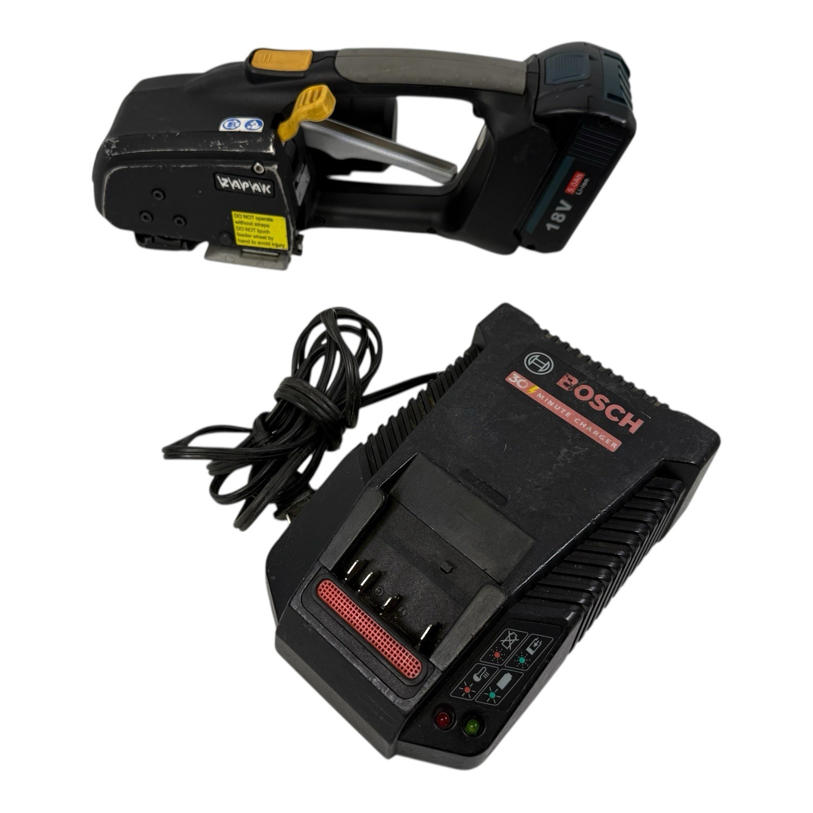 Used, tested and in good working condition. Listing is for the strapping tool, battery, and charger.